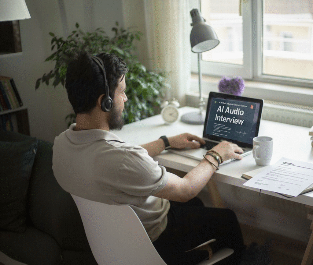 Our AI instantly analyzes your profile, identifies key skills and experience, and generates role-specific audio interview questions.